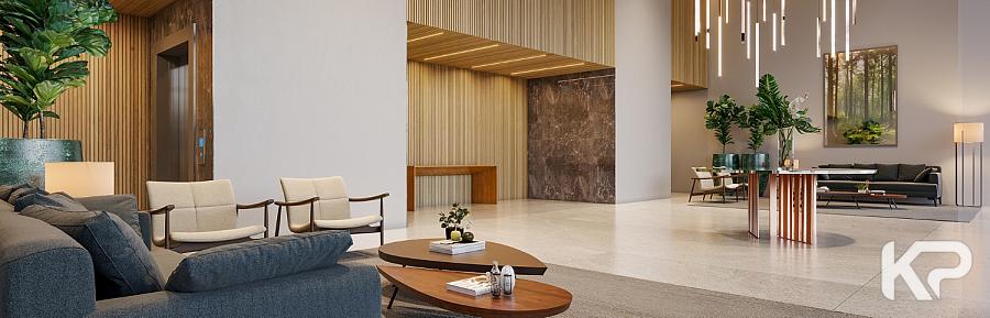 • Lobby com pé direito duplo, criando uma entrada imponente.
