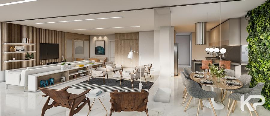• Estar/jantar com piso nivelado à varanda, proporcionando um ambiente amplo e fluído.